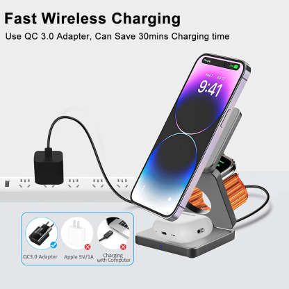 This wireless charging station is specially designed to be compatible with Apple Magsafe chargers. When using an 18W fast charger (not included), you can fully charge your device in just 2-3 hours. 3-in-one charger for Apple Watch/iWatch/Airpods/iPhone 14,13,13Pro, 13Pro Max,12,12Pro,12 Pro Max.