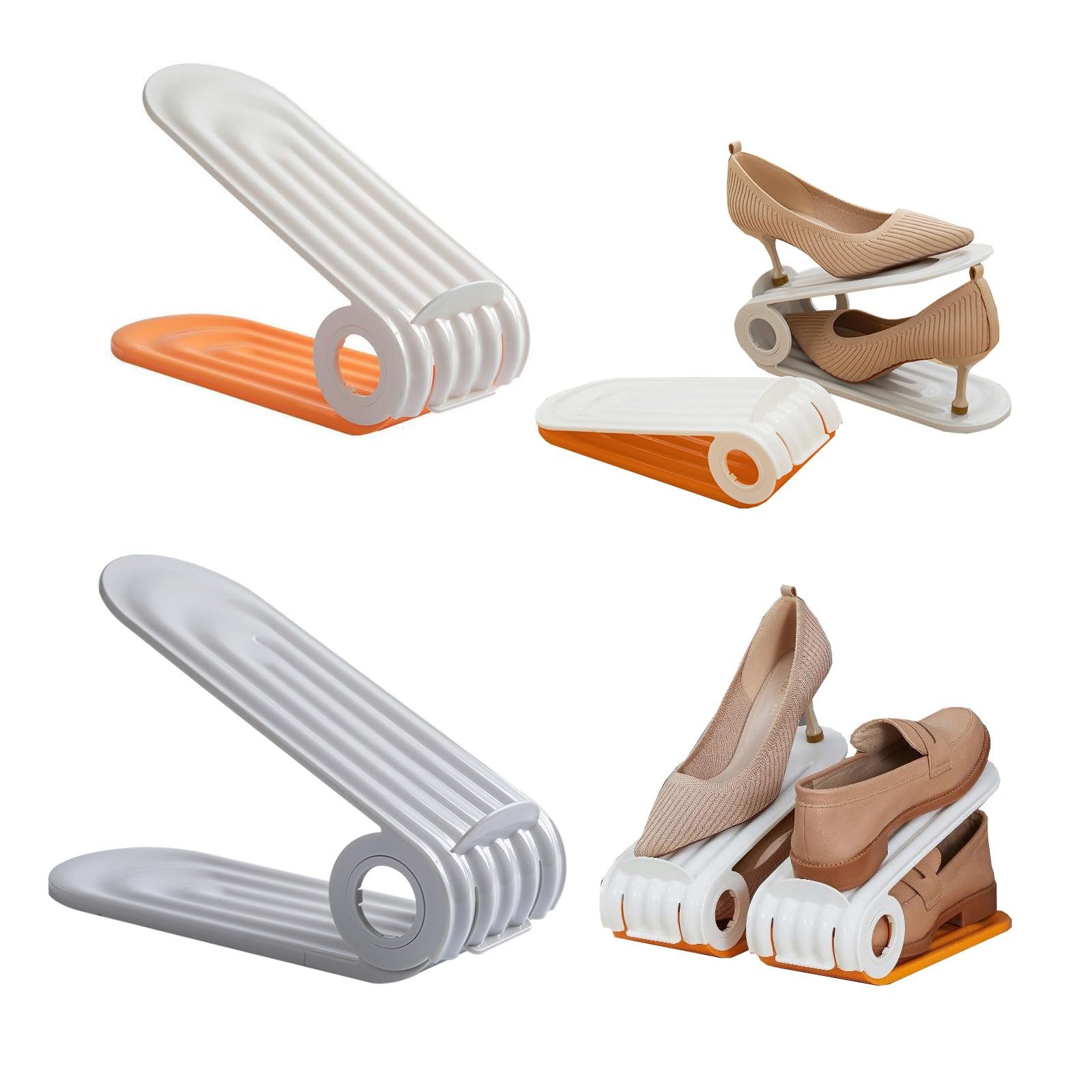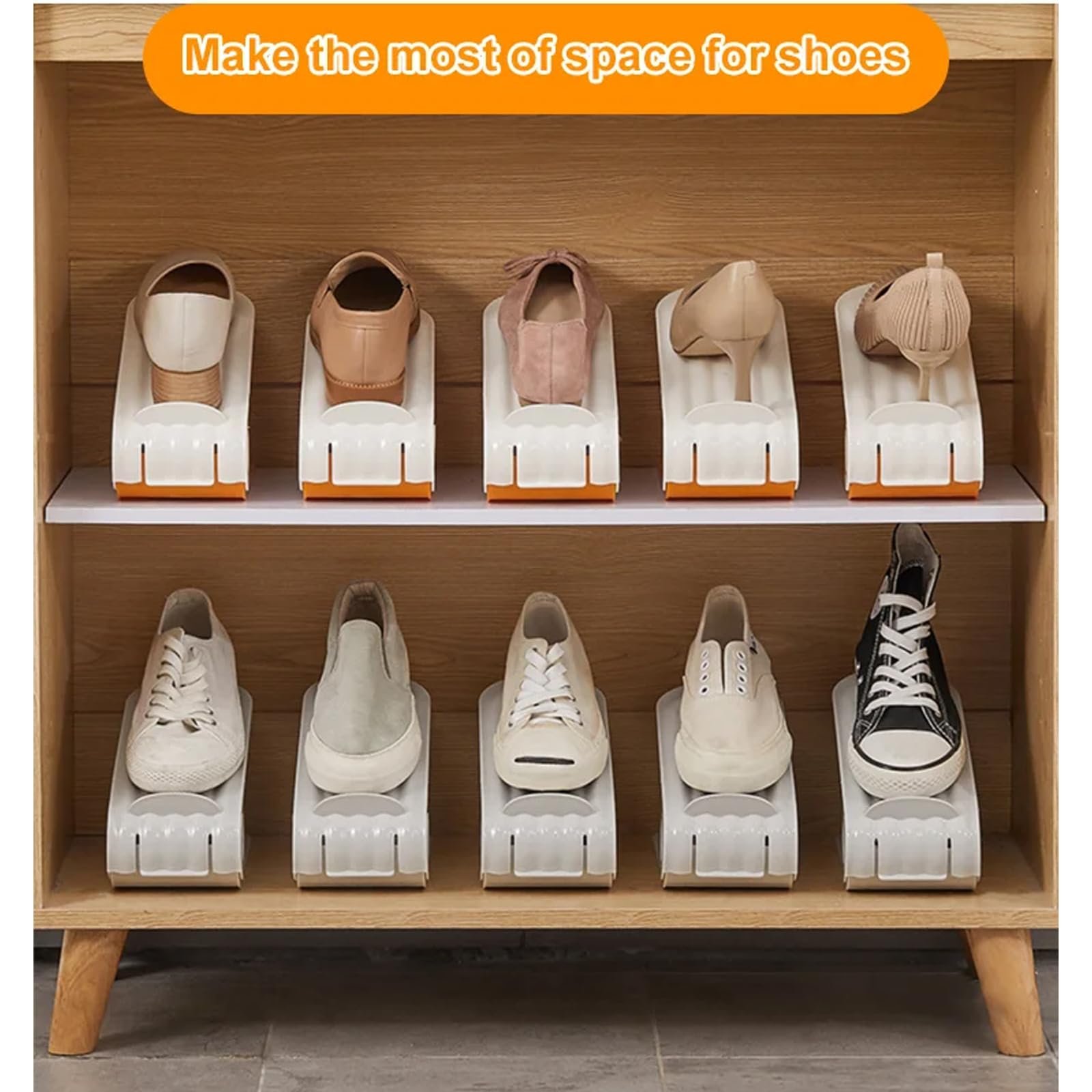 Save 50% Space: The double-layer shoe rack design helps save 50% storage capacity instantly, and helps you quickly find the right shoes, making your shoe cabinet and wardrobe more neat and organized.